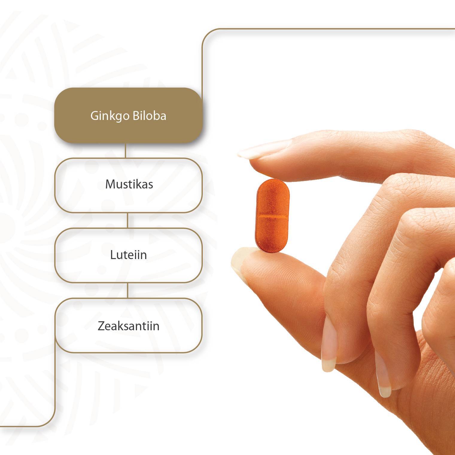 Ginkgo Lutein tabletid sidaldavad luteiini ja zeaksantiini, mis on taimsed pigmendid ning antioksüdand. Mõlemad kuuluvad karotenoidide rühma. Need toimivad looduslike päikeseprillidena, kaitstes silma kahjuliku ultravioletkiirguse eest ja ennetavad silmahaigusi.