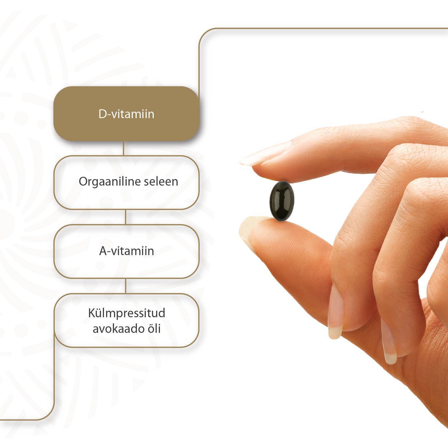 Koostisosad: avokaado (Persea Americana) külmpressitud õli, želatiin, niiskusesäilitaja glütserool, puhastatud vesi, retinüülpalmitaat, kolekaltsiferool, selenometioniin, riisitärklis, toiduvärv klorofülliin.