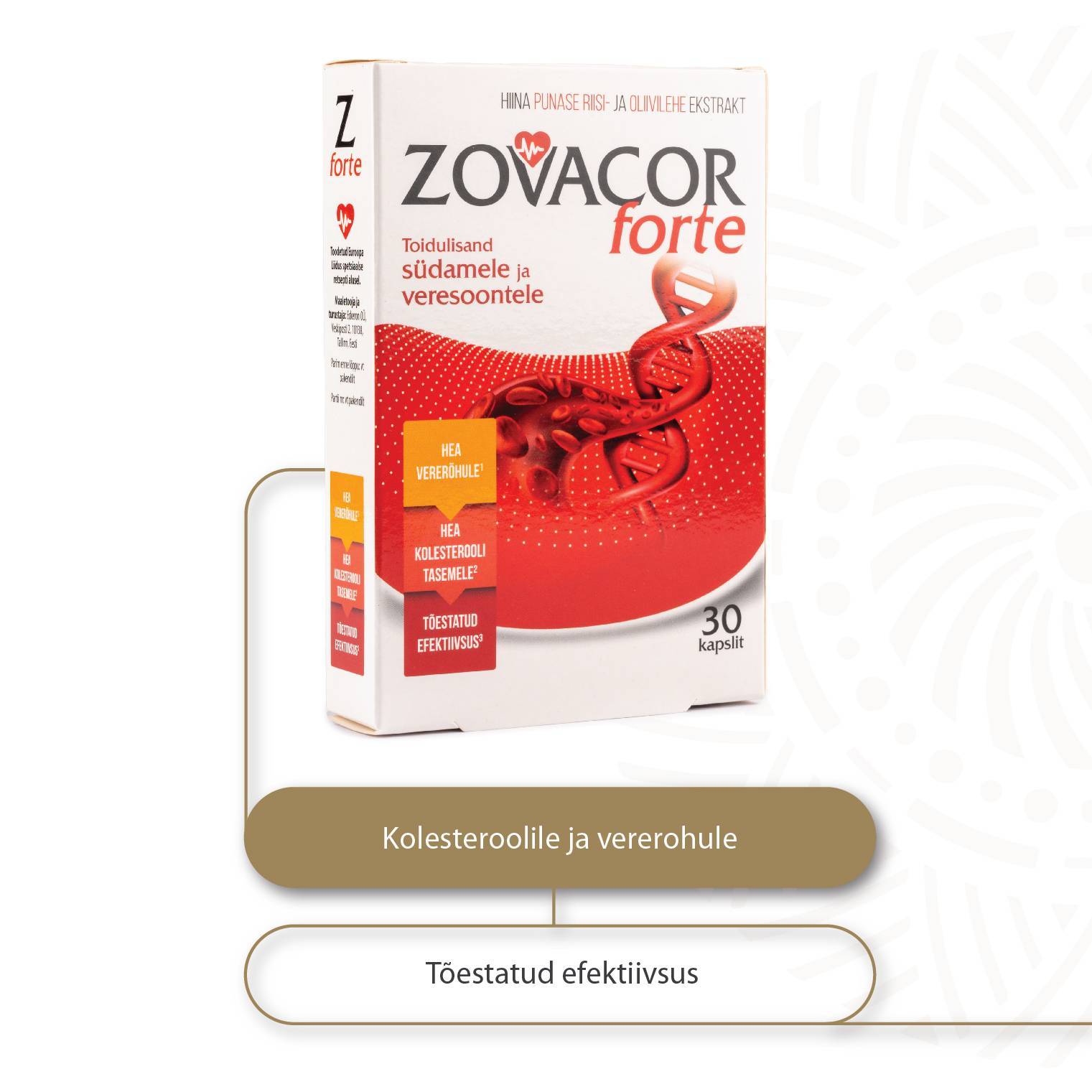 Zovacor Forte on spetsiaalne toidulisand südame ja veresoonte tervise säilitamiseks Hiina punase riisi, punase sibula ja oliivilehe ekstraktidega.